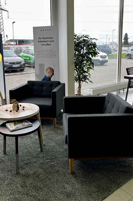 Hallo liebe Kunden , ich warte aktuell auf mein Auto und entspanne dabei in der neuen Sitzlounge im CarCenter.